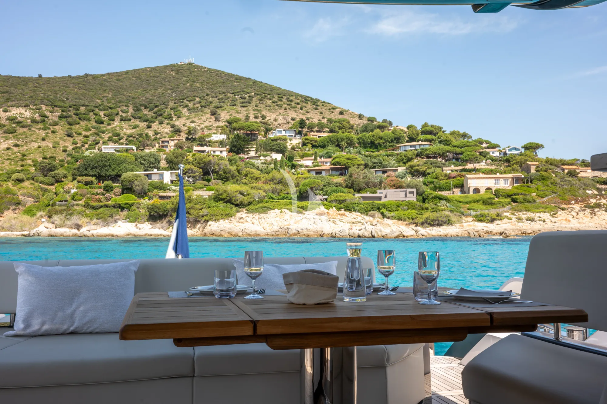 A l’extérieur, il y a deux zones de divertissement distinctes ; un coin salon avant avec un grand bain de soleil et un large cockpit.
