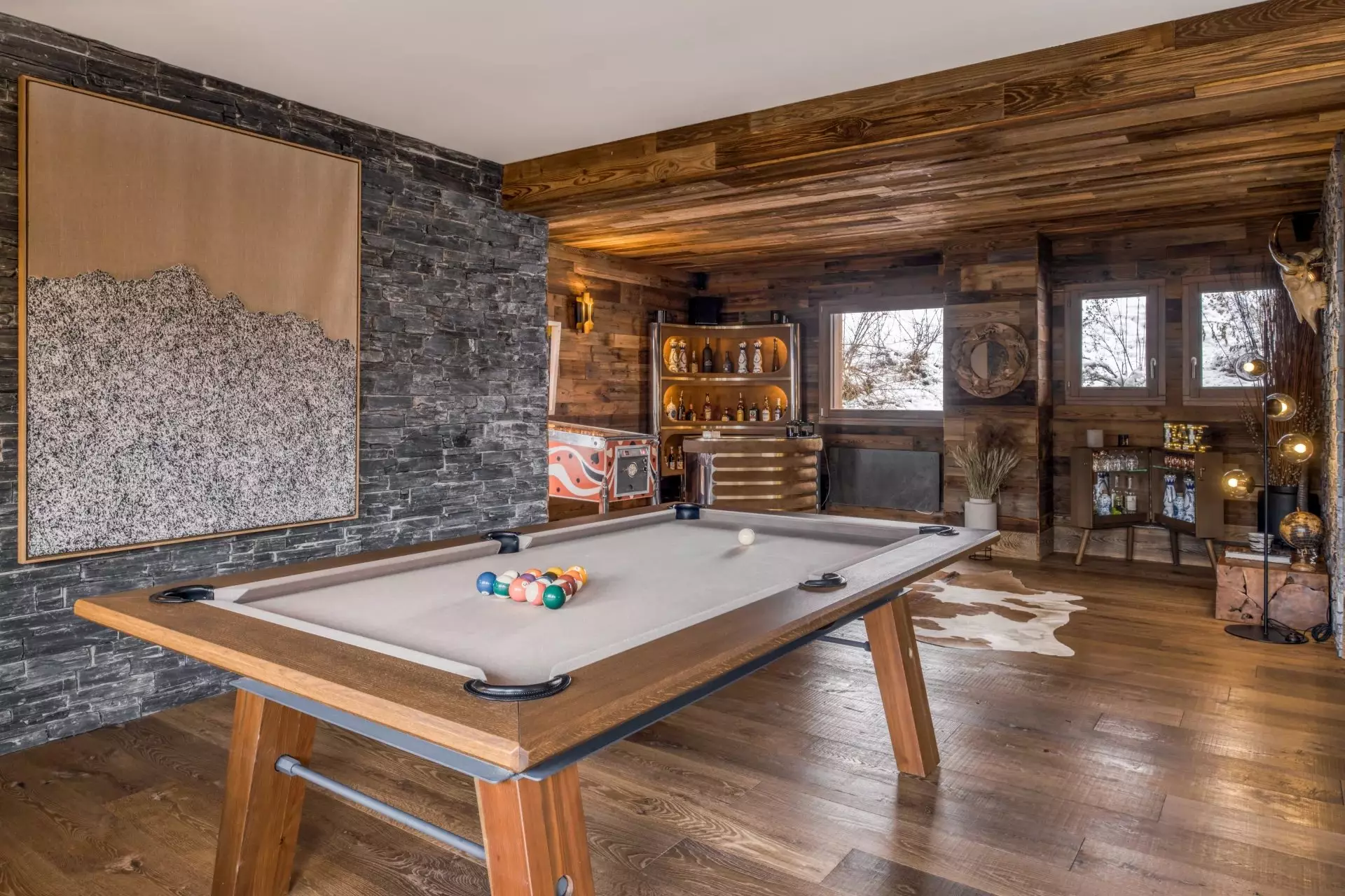 Au rez-de-chaussée, la pièce à vivre dispose d’une belle cheminée et d’un coin billard pour des moments de convivialité. La cuisine entièrement équipée s’ouvre sur le séjour et donne accès à une terrasse extérieure ensoleillée, idéale pour profiter des journées en montagne.