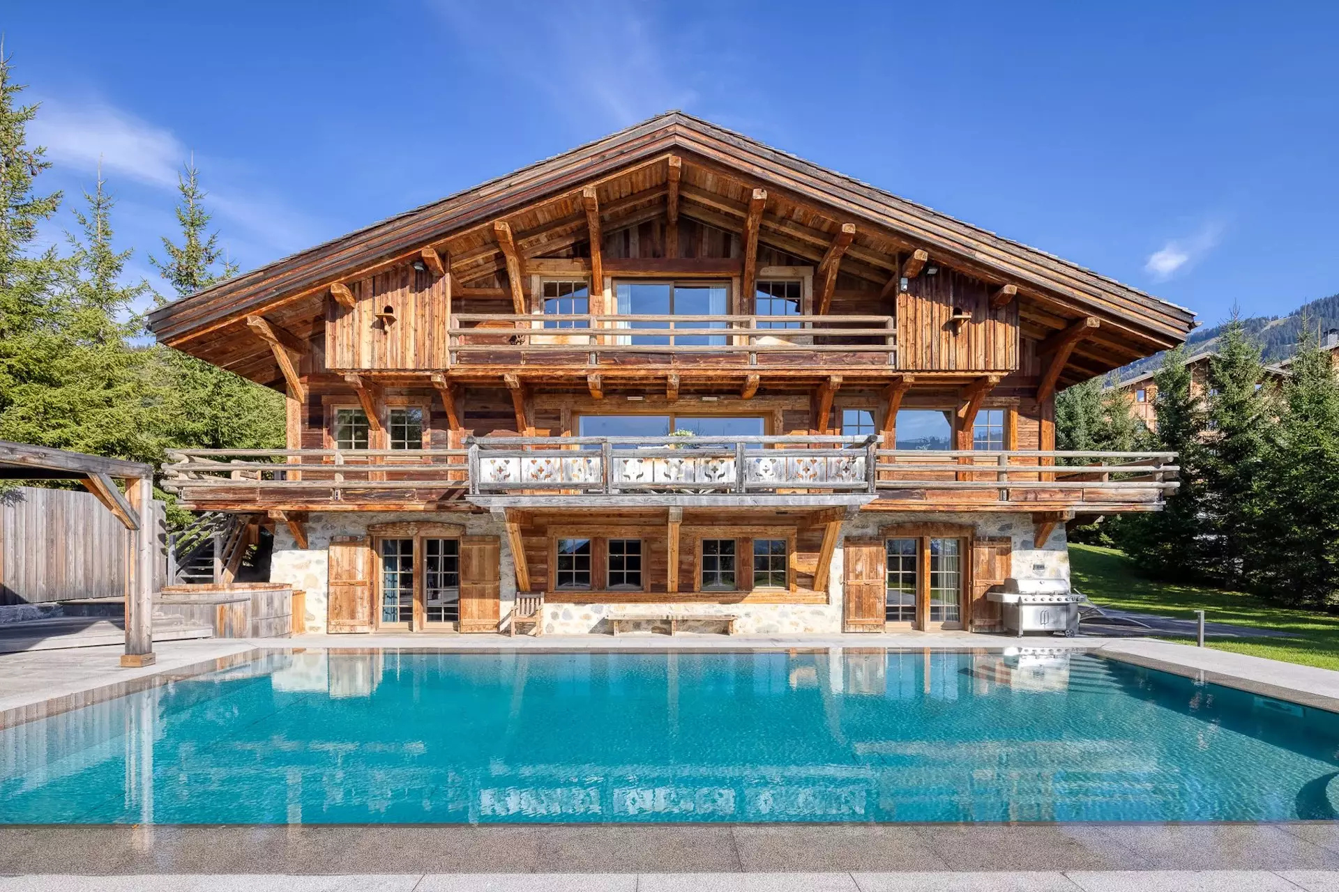 Ce bien rare dispose de huit chambres, dont un dortoir et une chambre pour le personnel, pouvant accueillir jusqu’à 20 personnes. Avec plus de 1 000 m² habitables, le chalet combine le chic traditionnel des Alpes avec des équipements modernes. Il bénéficie d’une exposition au soleil toute la journée et d’une vue panoramique sur les montagnes environnantes.