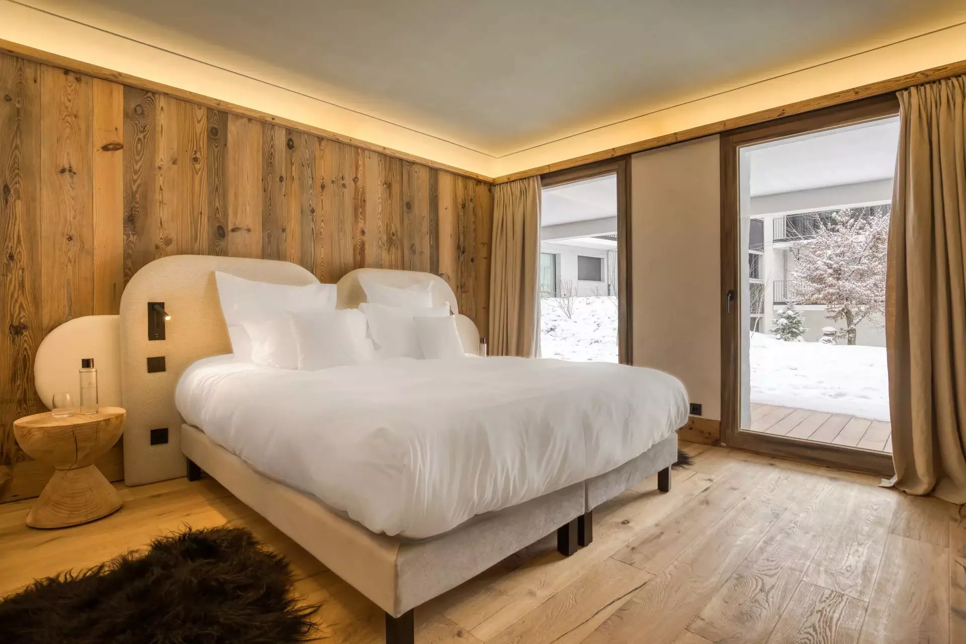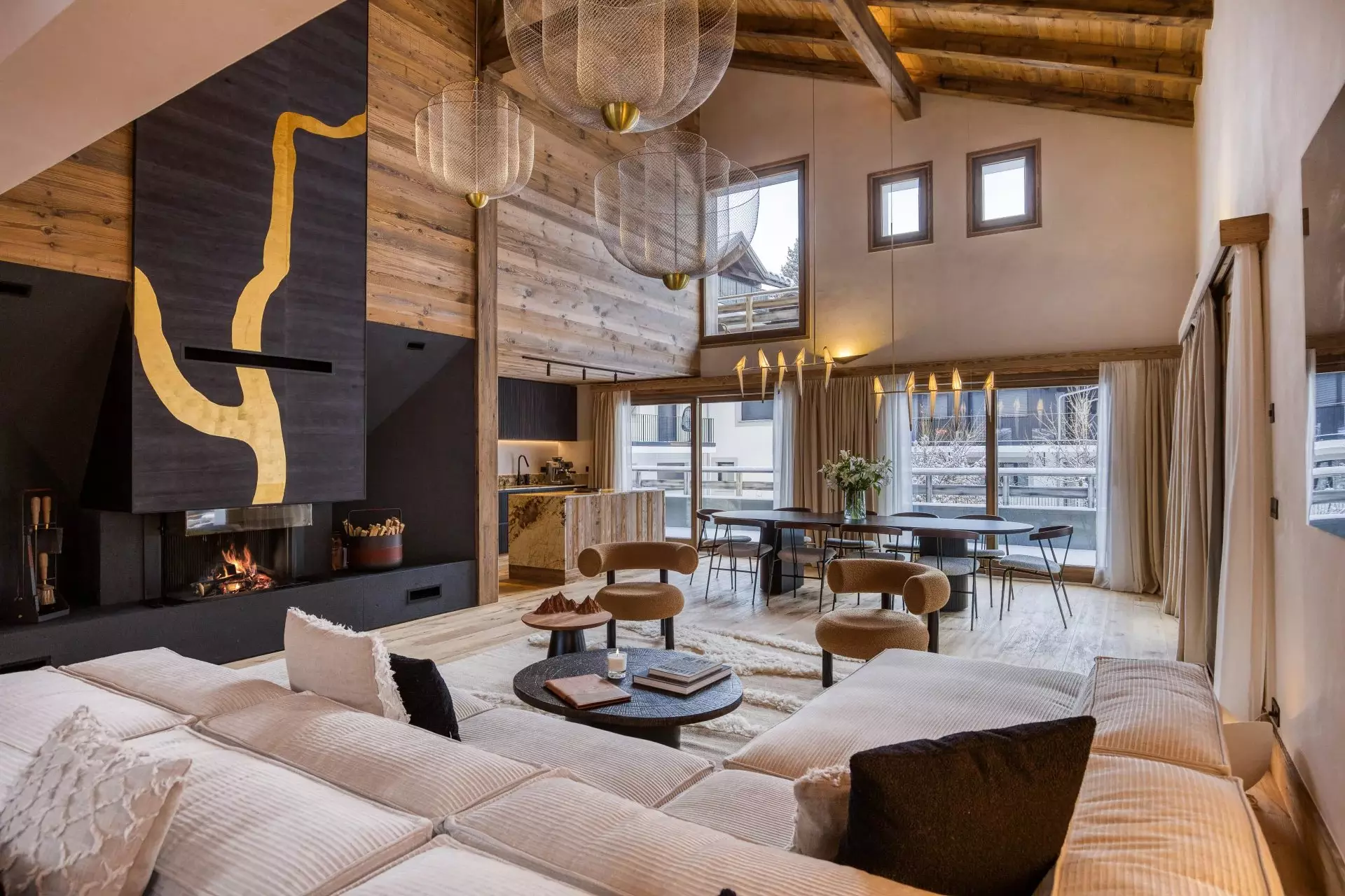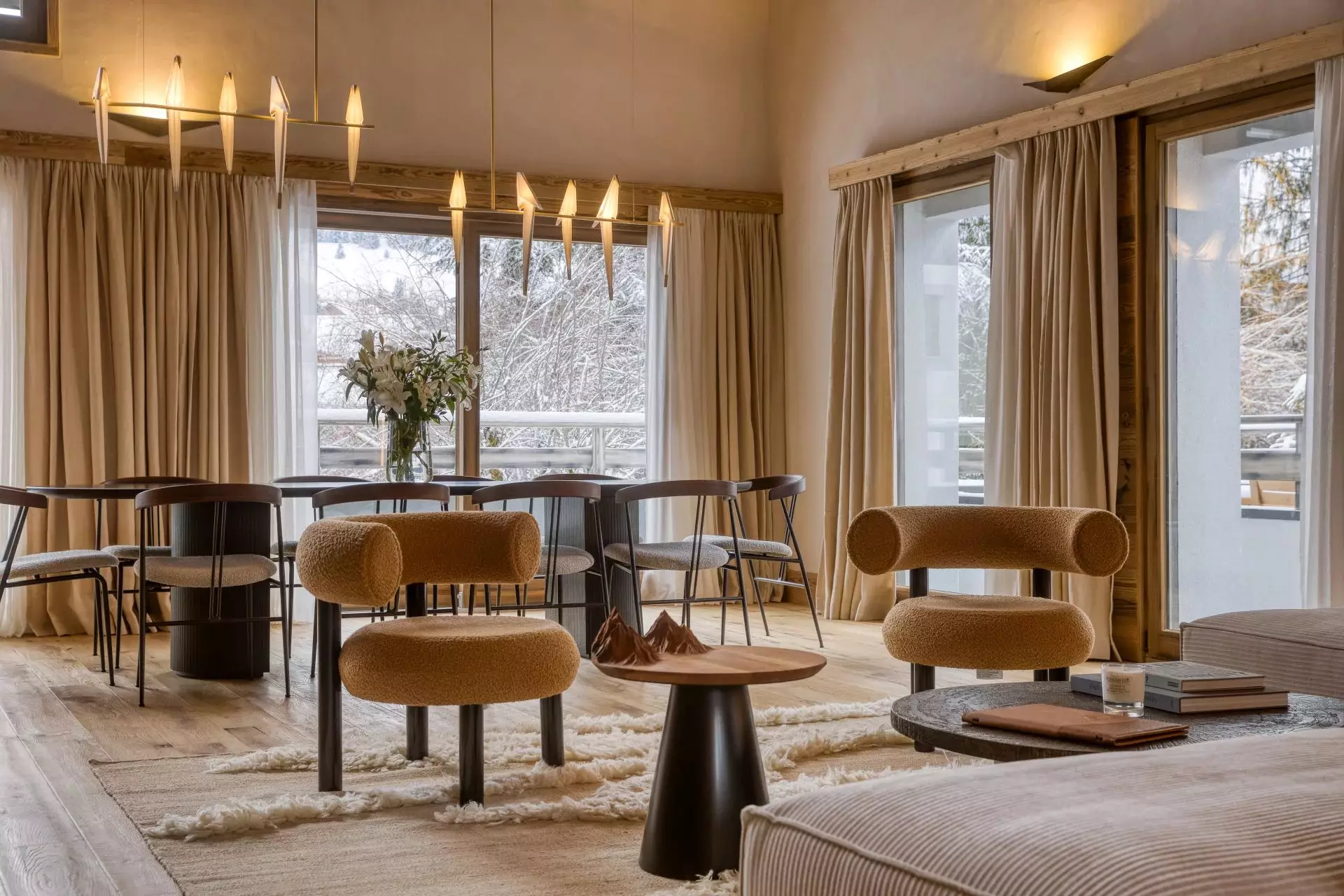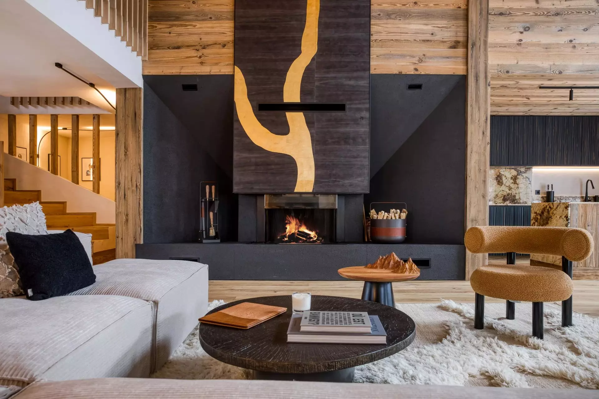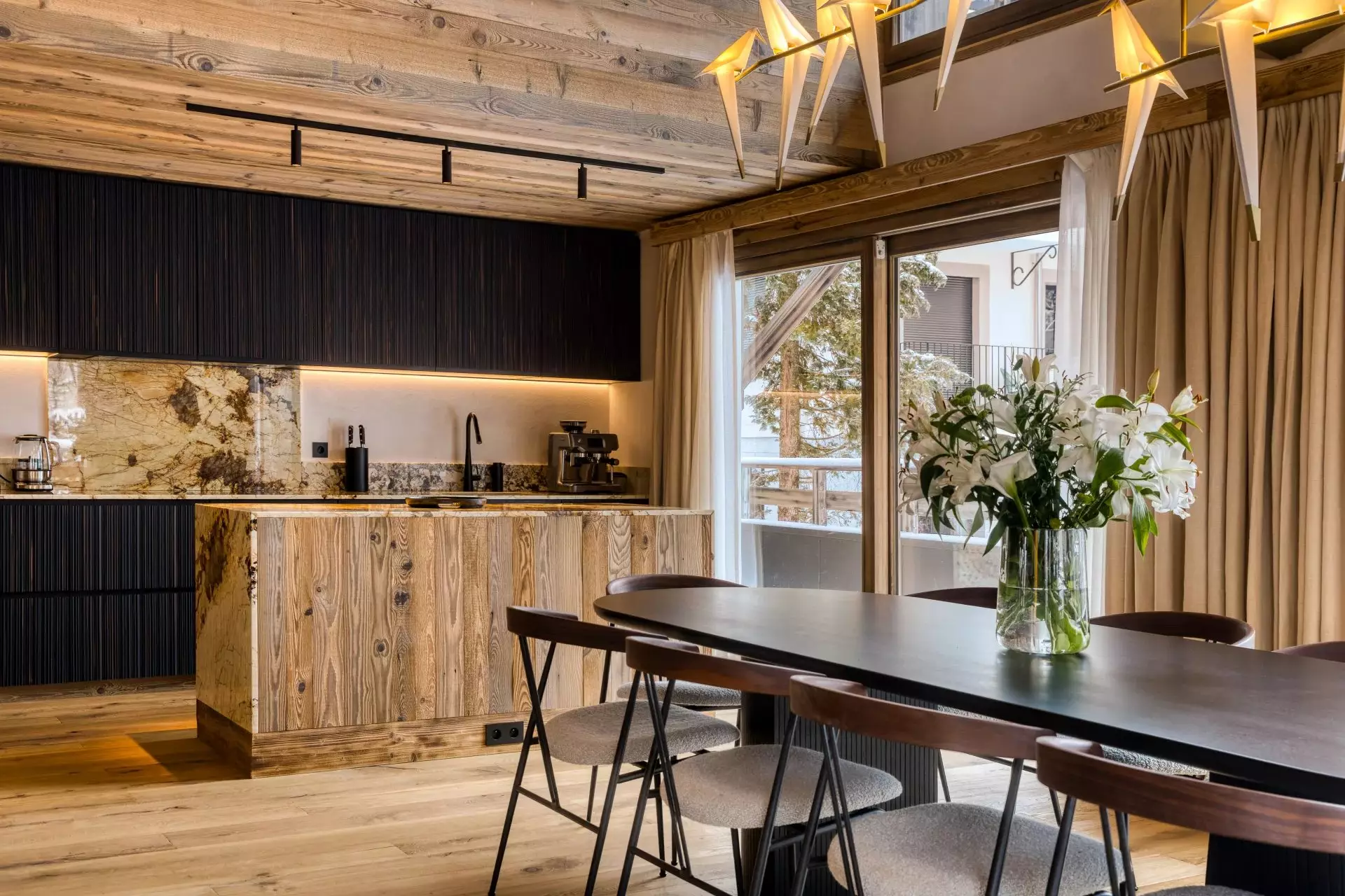 Le style franc et épuré de la décoration révèlent la beauté des matériaux bruts naturels tels la lauze, la pietra Patagonia, les différentes pierre des salles de bains ou les essences de noyer, chêne et vieux bois des Alpes.