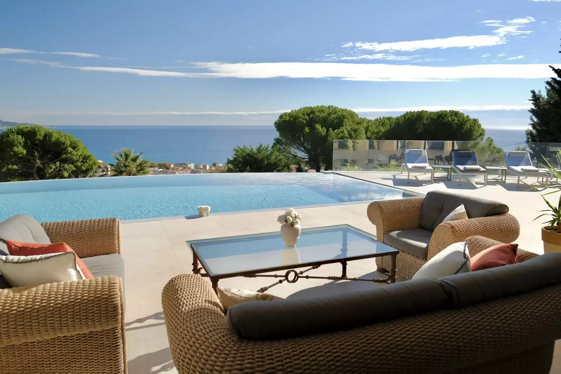 À louer, magnifique villa alliant luxe et sérénité, située au bout d’un chemin paisible, entourée d’un jardin de 2500 m². Cette villa récemment construite offre une expérience inoubliable avec une vue imprenable sur la côte italienne depuis la terrasse en pierre naturelle et la piscine à débordement chauffée.